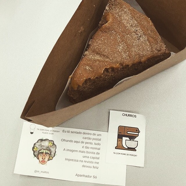 Outro projeto da estudante que já está em prática é O Bolo da Isa. “Surgiu quando eu estava no colégio, com vontade de comer bolo integral e disseminar poesia”, recorda. Os bolos eram vendidos na escola até chegar a fazer fila para comprar. “Quando entrei na faculdade de moda, parei de vender, para organizar essa nova fase da minha vida. Agora no 3º semestre voltei a fazer os bolos, e com mais visão de oportunidade achei que podia rolar uma troca”, conta Isadora. A ideia da poesia era encorajar as pessoas a tirar o que escreviam da gaveta e também o que desenhavam, pintavam e mostrar para tudo. Agora, os bolos ganharam novos sabores e novas letras e cores para alimentar o corpo e a alma.
